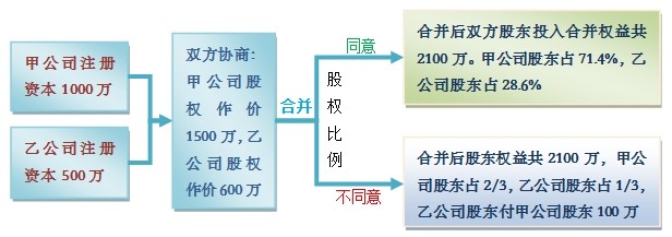 从理论上说,增资并购是资本与货币的合作,而合并并购却是资本与资本的合作,因此,合并并购要比增资并购复杂得多。从实践中看,合并并购谈判的核心问题就是公司合并后,参与合并的各公司股东在合并后的公司中各占有多少股权比例,以及参加合并的各公司股东股权的作价额。比如甲乙两个公司进行合并,甲公司的注册资本额为1000万元,经双方在披露调查的基础上协商确定该公司股东的全部股份作价1500万元;乙公司注册资本额为500万元,经双方在披露调查的基础上协商确定该公司股东的全部股权作价600万元。双方股东投入合并后公司的权益总额为2100万元,其中甲公司股东投入1500万元,应占合并后公司的股份比例为71.4%;乙公司的股东投入600万元,应占合并后公司的股份比例为28.6%。公司的注册资本则为合并前两公司注册资本之和即1500万元。如果这个股份比例不符合双方事先商定的合并后公司的股份比例,可以通过找差价的方法解决。比如在上例中参加合并的各方股东商定合并后的股权比例为甲公司占2/3,乙公司占1/3,这样合并后公司的总权益额为2100万元,甲公司的股东应投入1400万元,实际收入1500万元,多投入100万元;乙公司的股东应投入700万元,实际投入600万元,少投入100万元,乙公司的股东向甲公司的股东找差100万元。