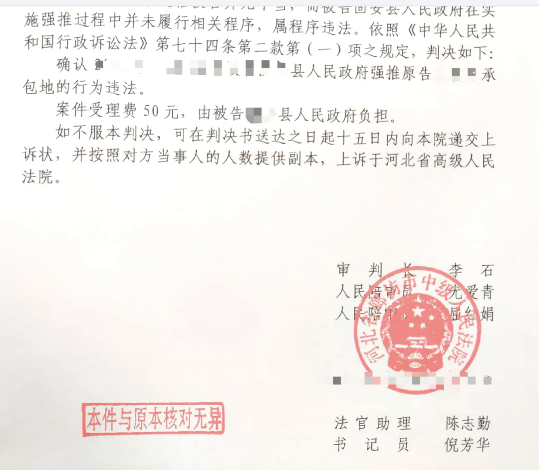 法院经审理后,认可圣运律师的意见,判决确认县政府强推邵先生承包地的行为违法。