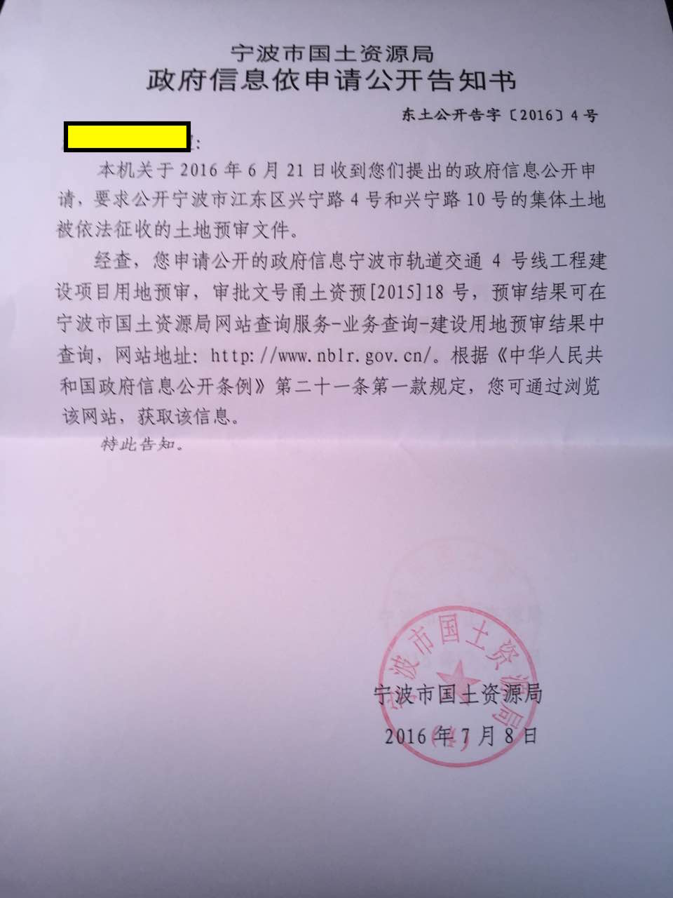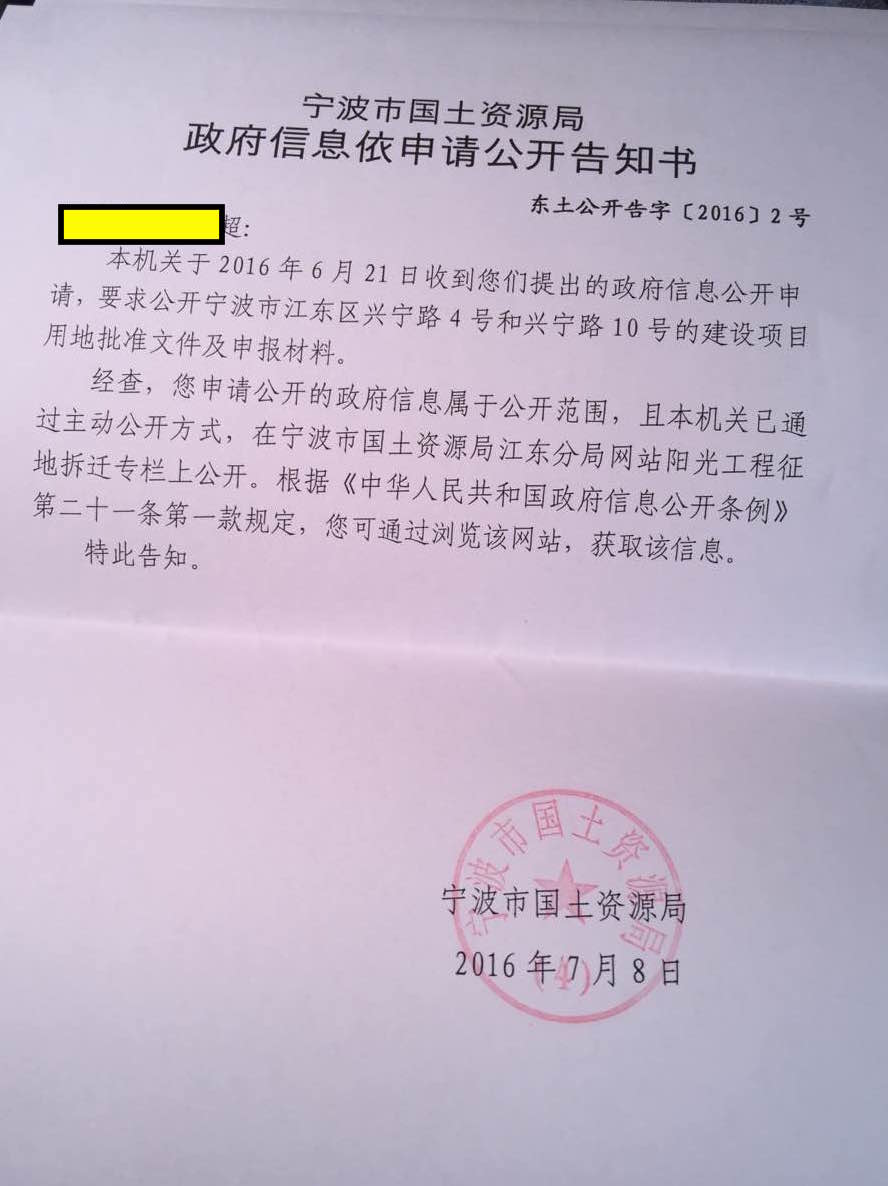 面对蛮横不讲理的拆迁办,王女士、赵先生于今年6月份找到圣运律师事务所王有银主任及其主办律师刘律师。王有银主任一针见血的指出拆迁办违法的事实,只要租赁合同在征收公告发布之日没有到期,就应该给予承租户合理合法的补偿。为此主办律师及时启动了相应的信息收集工作,于2016年6月21日指导当事人向宁波市国土资源局申请相应的政府信息,分别为征收相关的土地预审材料、征地批复及建设用地申报材料。