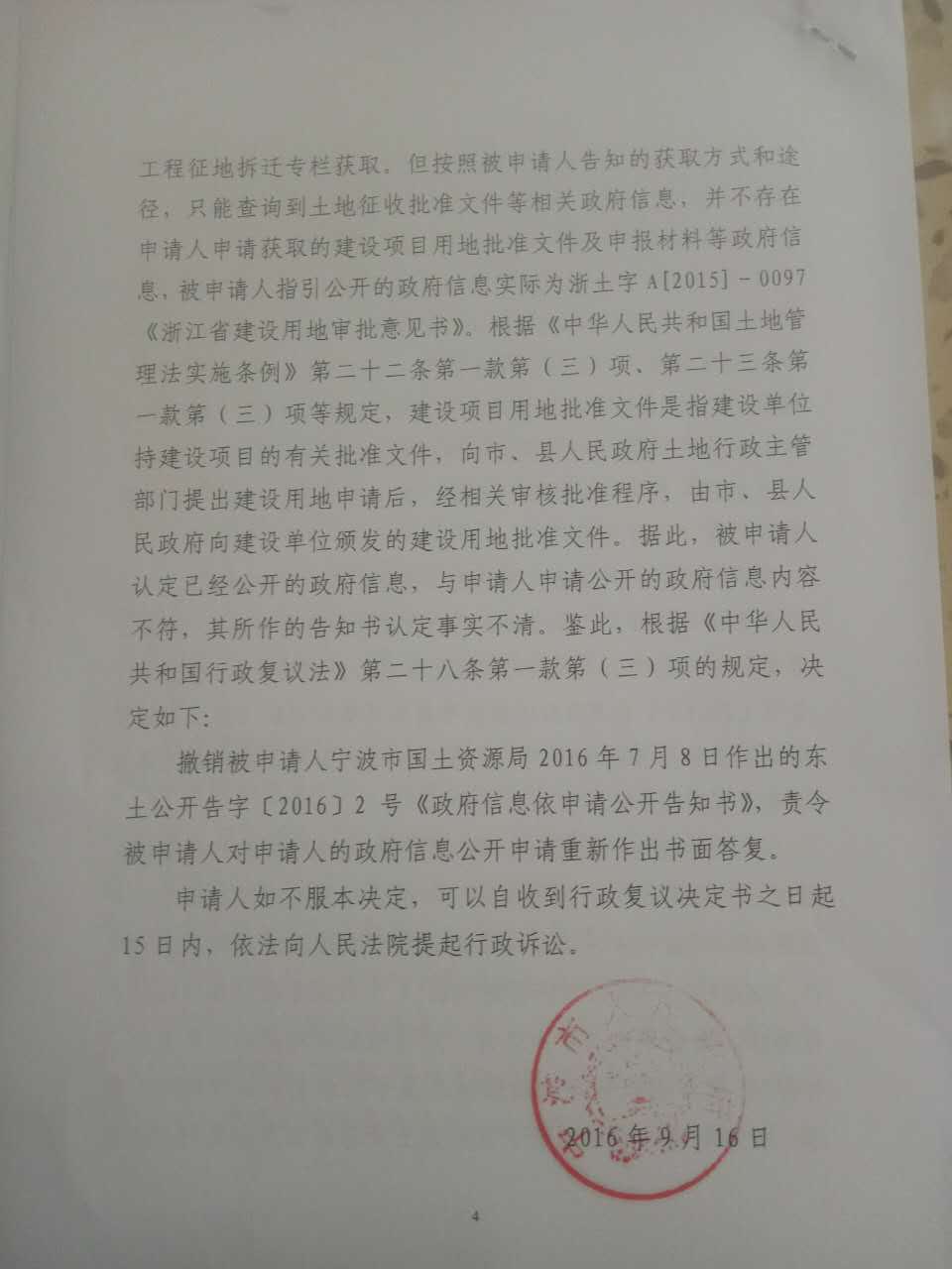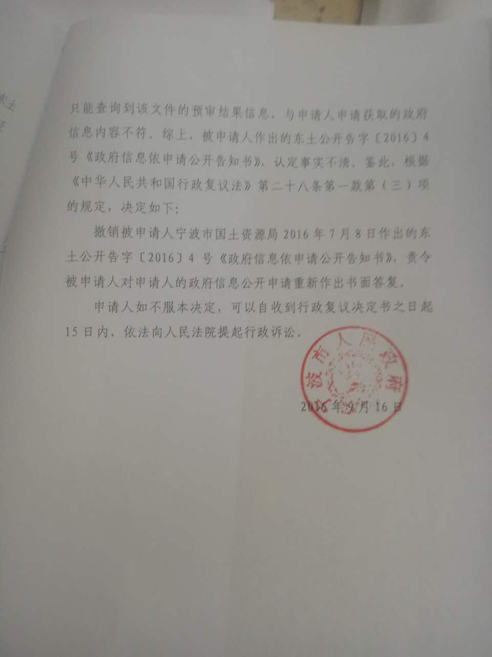 面对当事人的合理要求,宁波市国土局不仅没有及时给予答复,更是让当事人自己去网站上自己查询。为此主办律师及时启动了复议程序,希望上级机关能够纠正国土局的这种无视老百姓合理诉求的行为。