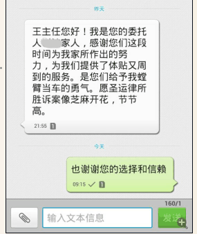 在各位圣运律师的手机里,大多保存着不少这样的短信。短短的一条信息,其实是当事人对律师高度的肯定和发自内心的感谢。圣运人将会携带着这些沉甸甸的信任,始终秉承"诚信、专业、极致,以个案推动法治"的理念,把每一个案子都做到最好,给当事人带去更多胜利的希望!