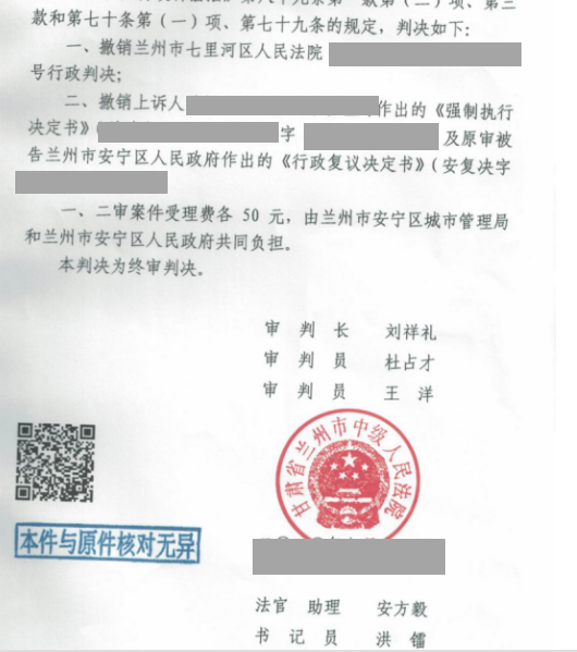 经过充分的准备和努力,二审法院认可了圣运律师的意见,判决撤销了一审法院的判决以及兰州市安宁区城市管理局作出的《强制执行决定书》和安宁区人民政府作出的《行政复议决定书》。这样的二审胜诉结果推进了刘女士的维权进程,也相信在律师的协助下,刘女士会更好的维护自己的合法权益,得到合理的补偿。