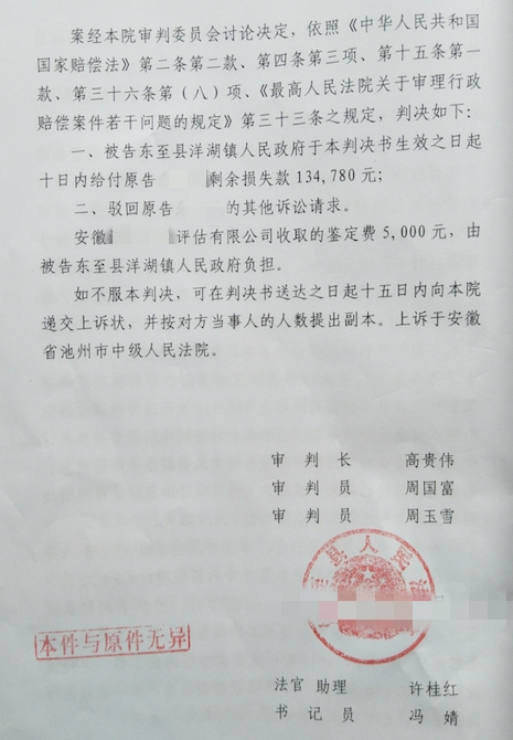 法院在查明案情后,判决东至县洋湖镇人民政府于判决书生效之日起给付刘先生的剩余损失款。
