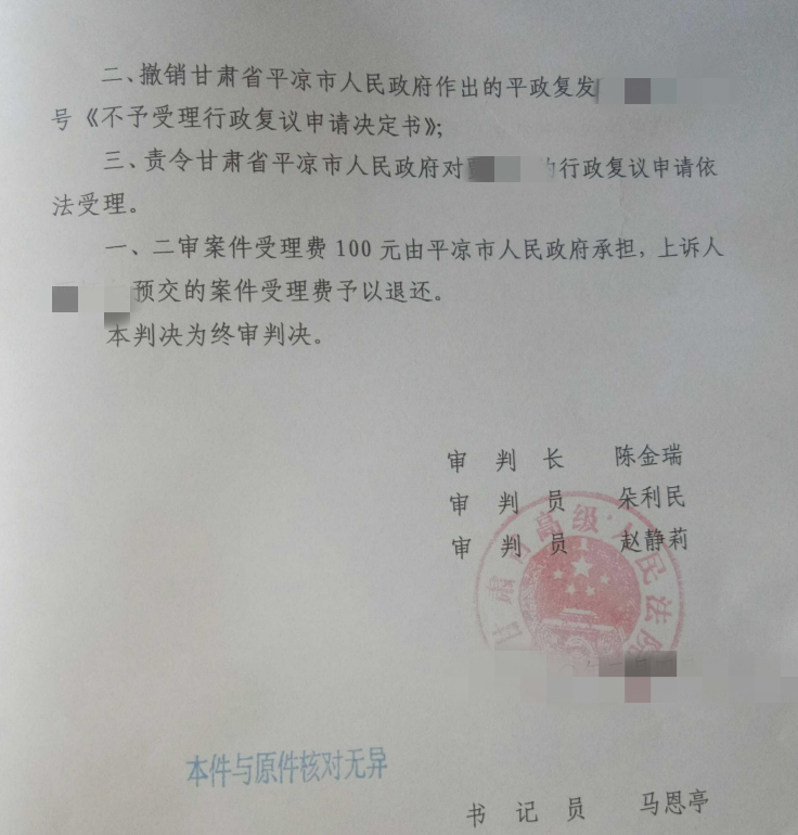 在圣运律师的努力下,二审法院也认为一审驳回张先生的诉讼请求适用法律错误,应予纠正,张先生的上诉理由成立。最终,二审法院判决撤销一审法院的行政判决及平凉市人民政府作出的《不予受理行政复议申请决定书》,并责令甘肃省平凉市人民政府对张先生的行政复议申请依法受理。