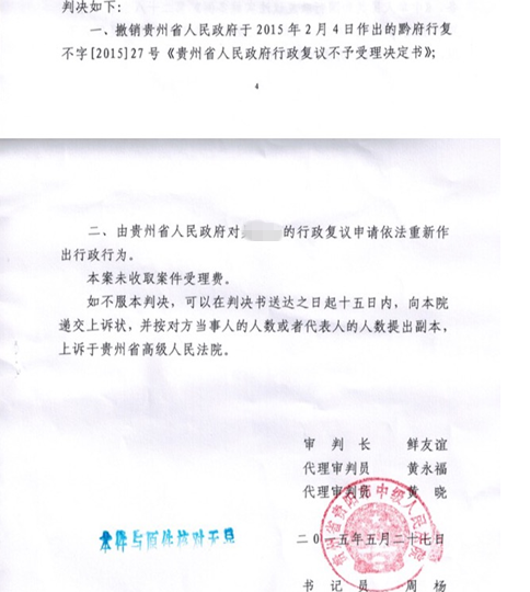 在两位律师帮助下,张先生向贵阳市中级法院提交行政诉讼申请书,根据《中华人民共和国行政复议法》等相关规定,张先生诉称政府驳回行政复议申请的行政行为属于侵犯其合法权益的行为,属于违法行为。
