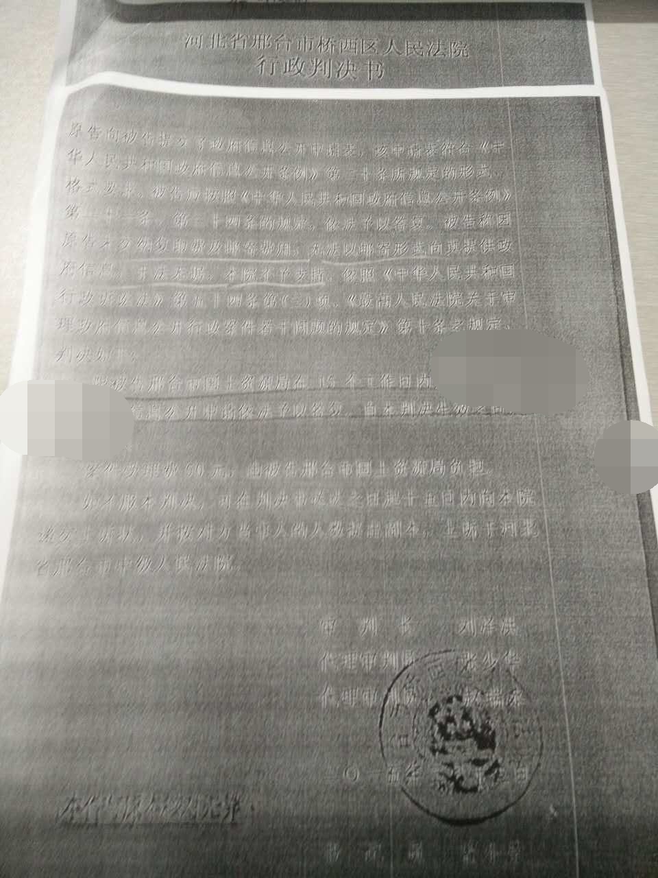 邢台市桥西区人民法院受理本案后,作出(2015)西行初字第10号《行政判决书》,责令被告邢台市国土资源局于本判决生效之日起15个工作日内履行政府信息公开法定职责。王女士的合法权益终于得到了维护。