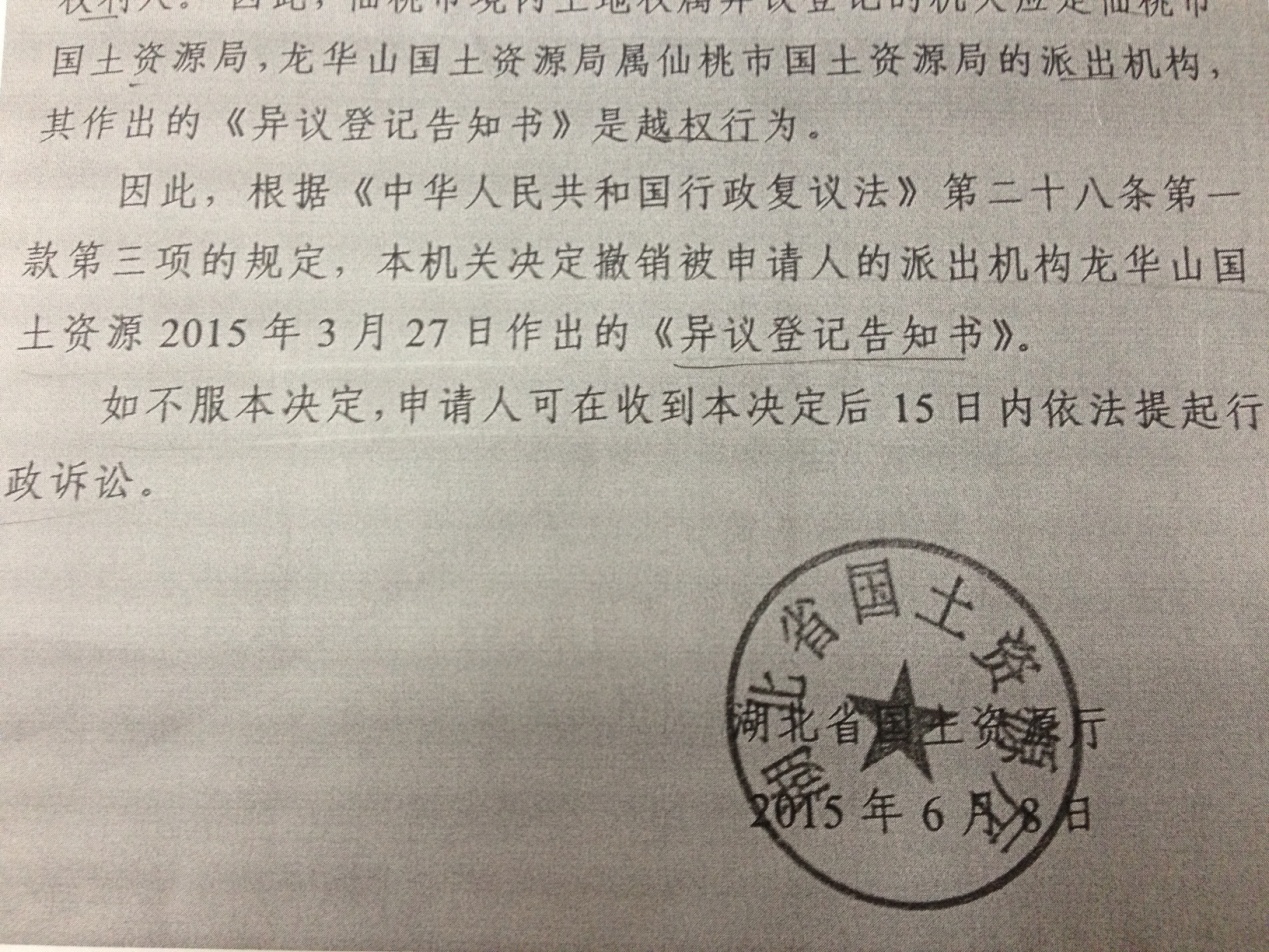 北京圣运律师事务所主任律师王有银认为,根据《土地登记办法》第三条和《土地登记办法》第六十条第二款规定可知,仙桃市境内土地权属异议登记的机关应是仙桃市国土资源局,龙华山国土资源局属仙桃市国土资源局的派出机构,其作出的《异议登记告知书》是越权行为。