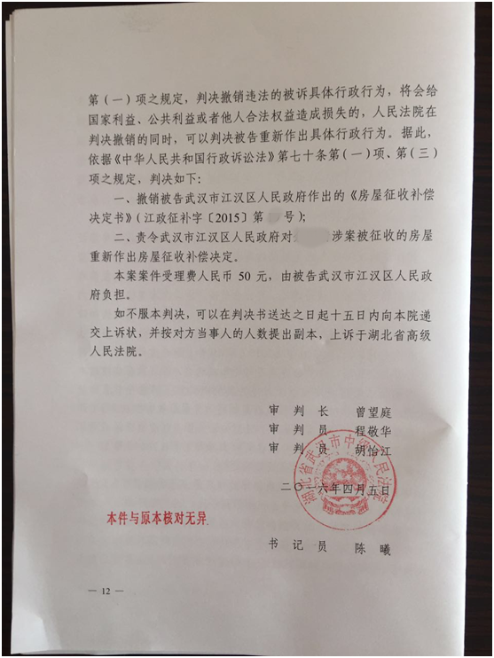俗话说,台上十分钟,台下十年功。二位律师认真、精心准备开庭相关的材料,利用自己承办征地拆迁数年近万例案件的丰富经验,从各个方面寻找案件的突破口。在法庭上针对该补偿决定书提出两点问题:第一,作为该补偿决定书的重要前提条件之一的《房屋征收股价分户结果报告》由于没有签字和送达,被法院认定为违法,直接后果是该补偿决定书的主要证据不足;第二,作出该补偿决定书后,江汉区人民政府仅仅公证,没有送达或者通知李先生,没有履行法定程序。在上述基础上,法院判决撤销该补偿决定书。当事人的合法权利最终得到了有效的保护。