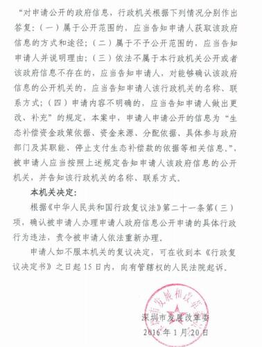 申请人是深圳市大鹏新区某村村民,自2007年起每月领取生态补偿款。然而,从2013年起申请人没有得到生态补偿款。为核实补偿款和停止发放补偿款的合法性,申请人委托了圣运律师事务所王有银主任及其团队主办律师,帮助自己于2015年8月28日向被申请人申请公开政府信息,包括生态补偿资金政策依据、资金来源、分配依据等。被申请人在8月31日收到申请后,至今未作出任何答复。申请人及两位律师认为被申请人没有履行信息公开职责,违反了《中华人民共和国政府信息公开条例》的规定,侵犯了申请人的合法权利,便果断的向深圳市发展和改革委员会提起行政复议,要求被申请人依法履行自己的职责。