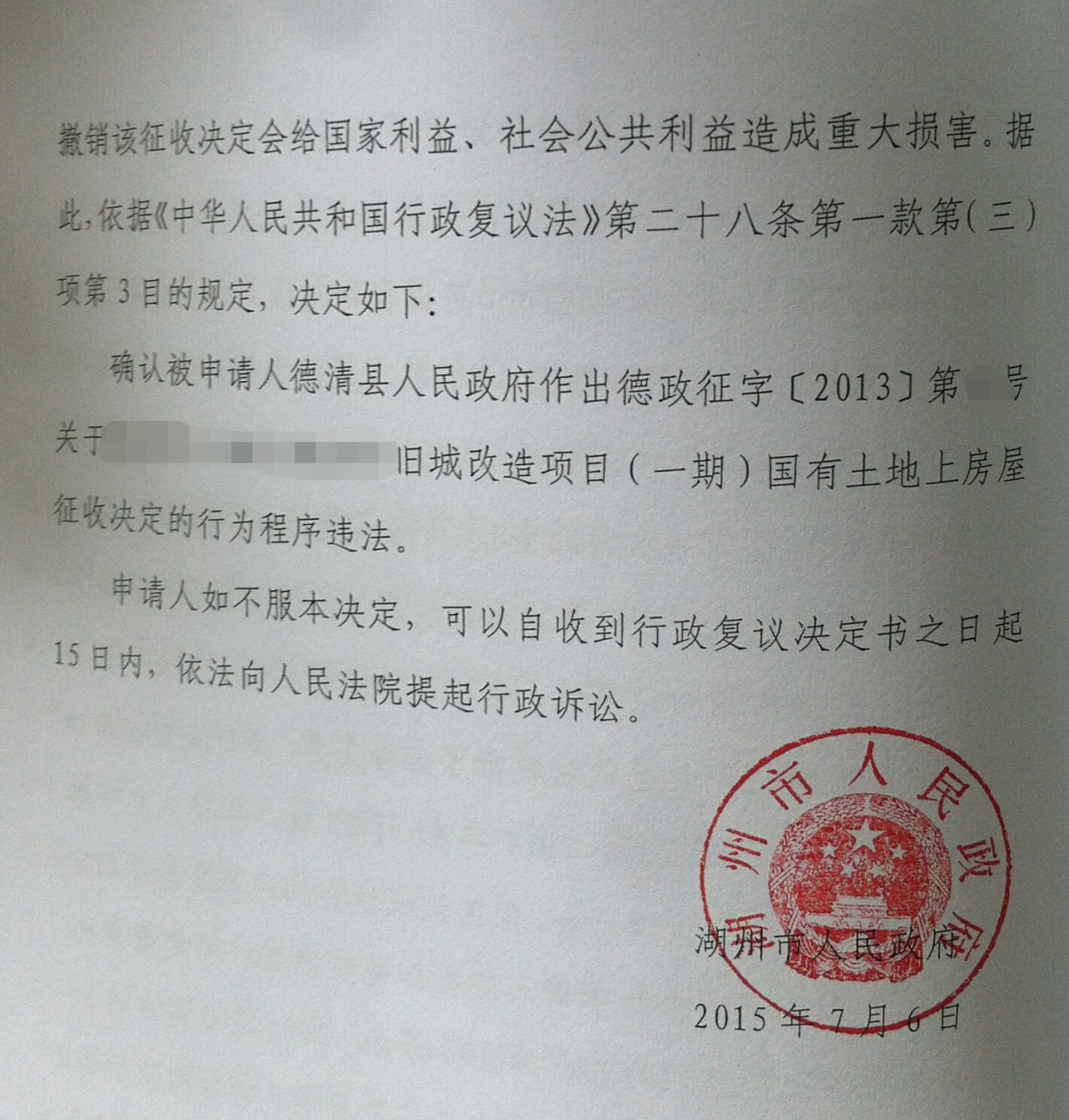 湖州市人民政府依法受理了行政复议申请。在圣运律师举出的充分的证据和有力的辩论面前,湖州市政府最终作出决定:确认德清县人民政府作出《德清县人民政府关于某旧城改造项目国有土地上房屋征收的决定》的行为程序违法。