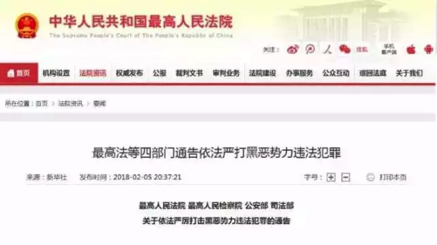 2018新年伊始,中共中央、国务院发布《关于开展扫黑除恶专项斗争的通知》。党中央、国务院决定,在全国开展扫黑除恶专项斗争。随后,四部门联合向黑恶势力发布"最后通牒"——最高人民法院、最高人民检察院、公安部、司法部发布《关于依法严厉打击黑恶势力违法犯罪的通告》,拉开了全国开展扫黑除恶专项斗争的序幕!