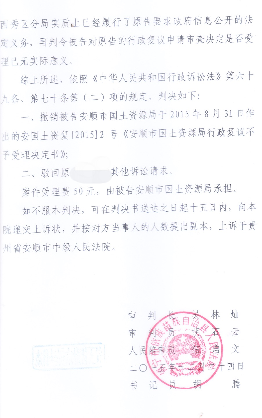 法院最终支持了吴先生的诉求,判决撤销安顺市国土局作出的《行政复议不予受理决定书》,至此吴先生请求信息公开的维权路终于画上圆满句点,也为下一步权利的争取奠定了良好的基础。