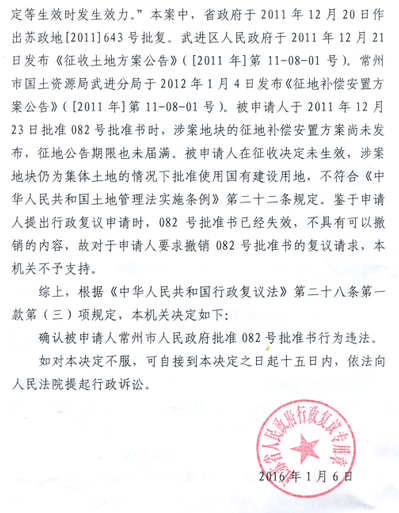 江苏省人民政府对案件进行了依法审理,并依据《中华人民共和国行政复议法》的相关规定,作出决定:确认被申请人常州市人民政府批准《征收土地方案公告》的行为违法。