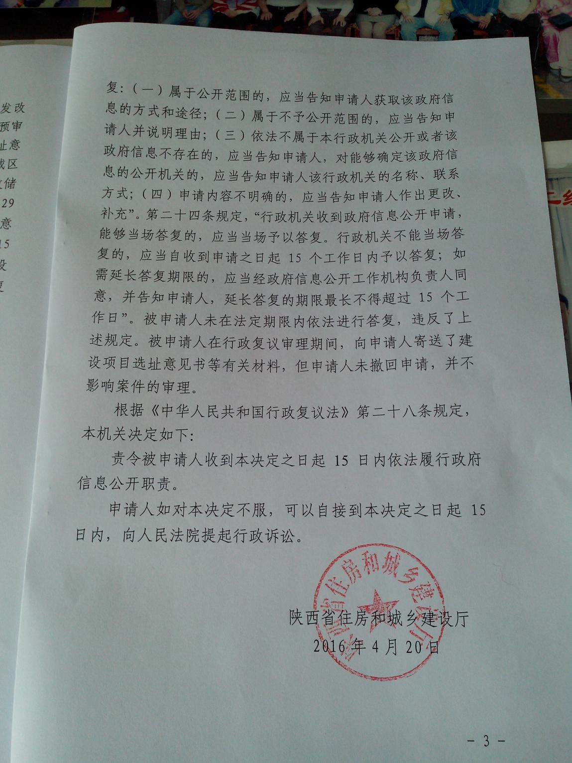 陕西省住房和城乡建设厅受理当事人的行政复议并对案件进行依法审理后,决定:责令被申请人法定期限内履行信息公开职责。