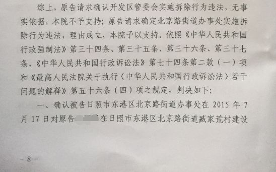 山东省日照市中级人民法院经过法庭审理后,判决如下:一、确认被告日照市东港区北京路街道办事处在2015年7月17日对原告陈先生在日照市东港区北京路街道臧家荒村建设的厂房事实的拆除行为违法;二、驳回原告陈先生对被告日照经济技术开发区管理委员会的诉讼请求。