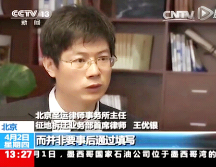 王有银 圣运律师事务所主任,北京理工大学法学院兼职教授、研究生导师,征地拆迁业务部首席大律师,近二十年法律服务经验,土地法专家,行政法实务专家。因在征地拆迁领域的突出贡献,多次被中央电视台CCTV新闻频道、CCTV财经频道、人民日报、法制日报、人民政协报、南方都市报、财新网、香港有线电视台、亚洲周刊、英国BBC电台等数百家中外媒体采访报道。《中国律师》杂志、《中国律师网》特邀评论员,《第一视频》特邀评论员,参与立法活动,为多个行政立法活动提供建议和意见。荣获"2013年度中国十大最具影响力律师"、"2015年度最受媒体欢迎律师"等称号。